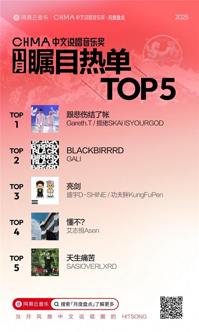“瞩目热单”以中文说唱周榜为数据支撑,展示当月热度最高的5首单曲。夺冠歌曲来自Gareth.T与揽佬联手打造的《跟悲伤结了帐》。该歌曲上线即霸榜,连续3周夺得11月说唱周榜冠军,两位说唱歌手的风格反差碰撞更是引发全网热议。实力说唱歌手GALI携全新单曲《BLACKBIRRRD》于11月重磅回归,歌曲将音乐性与文学性巧妙融合,构建了有质感的强者叙事,拿下“瞩目热单”TOP2。TOP3歌曲则是盛宇D-SHINE与功夫胖KungFuPen的合作曲《亮剑》,该歌曲连续2周进入说唱周榜,播放热度不减。艾志恒Asen《懂不?》、SASIOVERLXRD《天生痛苦》均闯入TOP5。