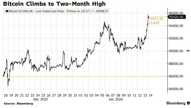 比特币价格触及两个月来的高点,随着地缘政治不确定性增强了其吸引力,其在1月份继续保持谨慎的上行势头。