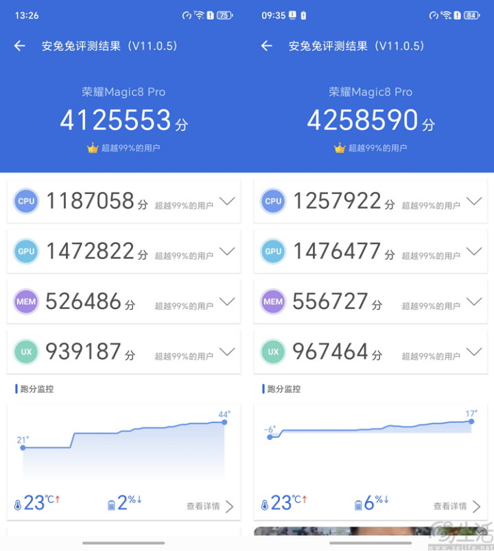 而且不只是CPU性能释放极为出众,Magic8 Pro的GPU性能调度也同样样激进。在我们手头,它的常温测试成绩和低温成绩几乎没有区别,而且也是今年到目前为止,首个能有如此表现的旗舰机型。
