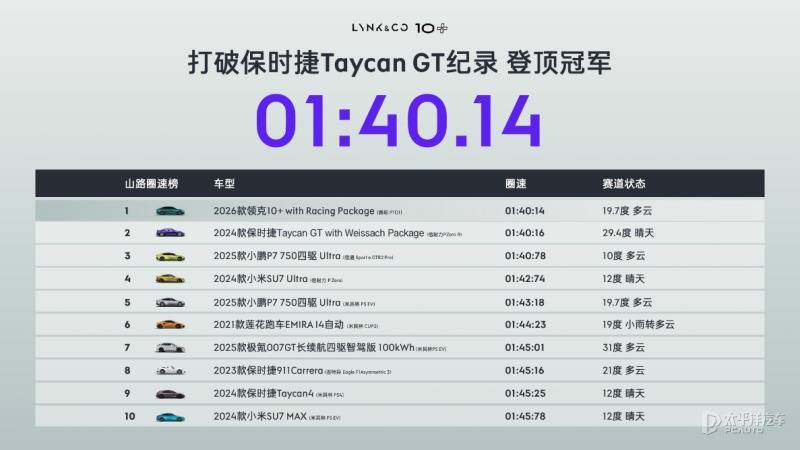 值得一提的是,领克10+联合领克汽车运动的赛道级调校并在官方性能套件的赋能下,领克10+ with Racing Package以1分40秒14的山路圈速成绩超越保时捷Taycan GT,取得亚洲山脊赛道圈速第一并登顶“弯道之王”。