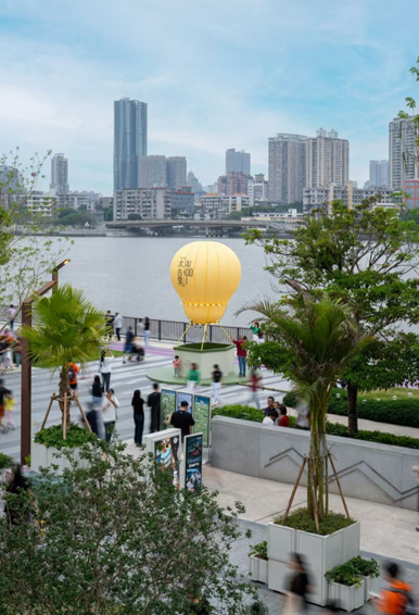 本次活动将持续至4月19日,围绕“滨水自然、活力社交、趣味运动与宠物友好”四大主题展开。项目沿江打造多组沉浸式艺术与互动装置,包括滨水步道上一座近5米高的巨型热气球装置,成为春日江畔的视觉地标;以匹克球为灵感打造的滨水PLAYGROUND,将潮流运动与户外社交融合;兼具白日城市取景框与夜间露天放映功能的江畔影院;以及近3米高的巨型钛杯装置,惊喜亮相仓前庭院,把山野的美好提前搬进都市里。多个装置在白天与夜晚呈现不同氛围,强化滨水空间的沉浸感与可参与性。